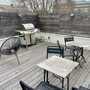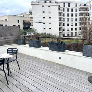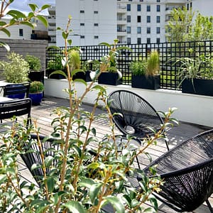 Ce rooftop avait un magnifique potentiel. Baigné de soleil, aux dimensions harmonieuses, le projet d’aménagement de ce rooftop réside dans la transformation en une véritable pièce de vie en plus. La palette végétale s’oriente vers des variétés résistantes à la sécheresse : pittosporums, osmanthes, nériums, olivier, eucalyptus, pinus mugo, céanothe, carioptéris… Les contenants en fibre noirs et en céramique bleue soulignent la décoration végétale et le mobilier en place. Désormais, la terrasse invite à la flânerie, à la détente et à la contemplation.